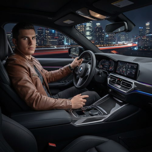Фото мужчины за рулём дорогого BMW на фоне ночного города. Детализированный салон с кожаными сиденьями и цветной подсветкой. Одежда: кэжуал